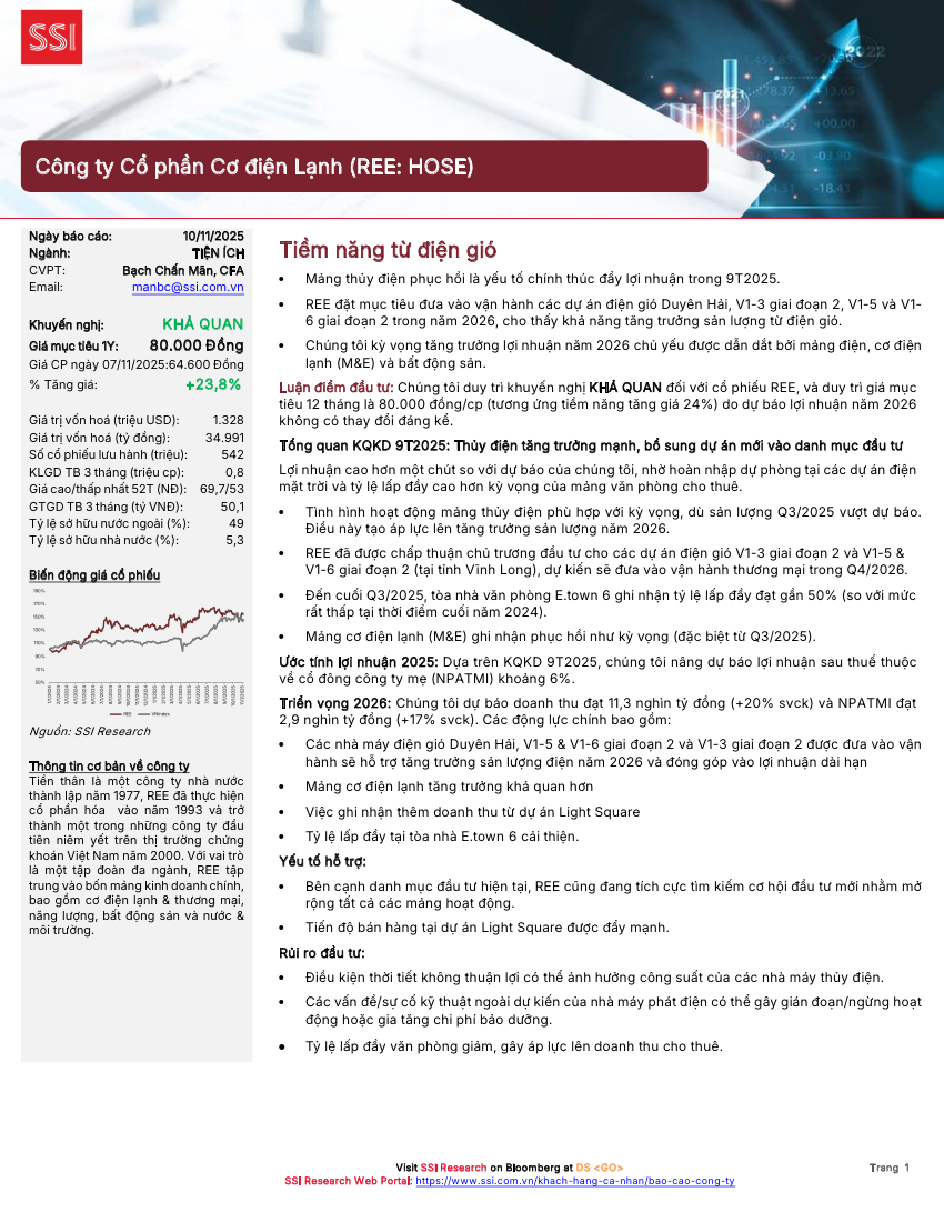 REE: Khuyến nghị KHẢ QUAN với giá mục tiêu 80,000 đồng/cổ phiếuNguồn: SSI Tải về 10/11/2025 |
