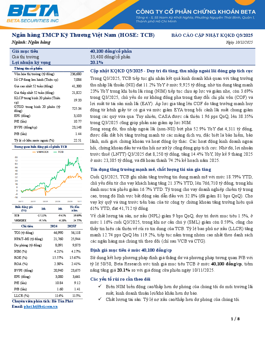 TCB: Khuyến nghị KHẢ QUAN với giá mục tiêu 40,100 đồng/cổ phiếuNguồn: Beta Tải về 10/11/2025 |