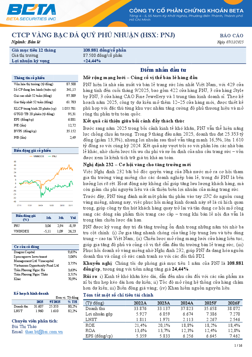 PNJ: Khuyến nghị KHẢ QUAN với giá mục tiêu 108,881 đồng/cổ phiếuNguồn: Beta Tải về 07/11/2025 |