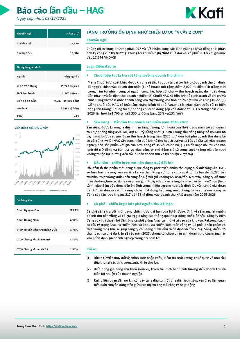 HAG: Khuyến nghị NẮM GIỮ với giá mục tiêu 17,550 đồng/cổ phiếuNguồn: KAFI Tải về 03/12/2025 |