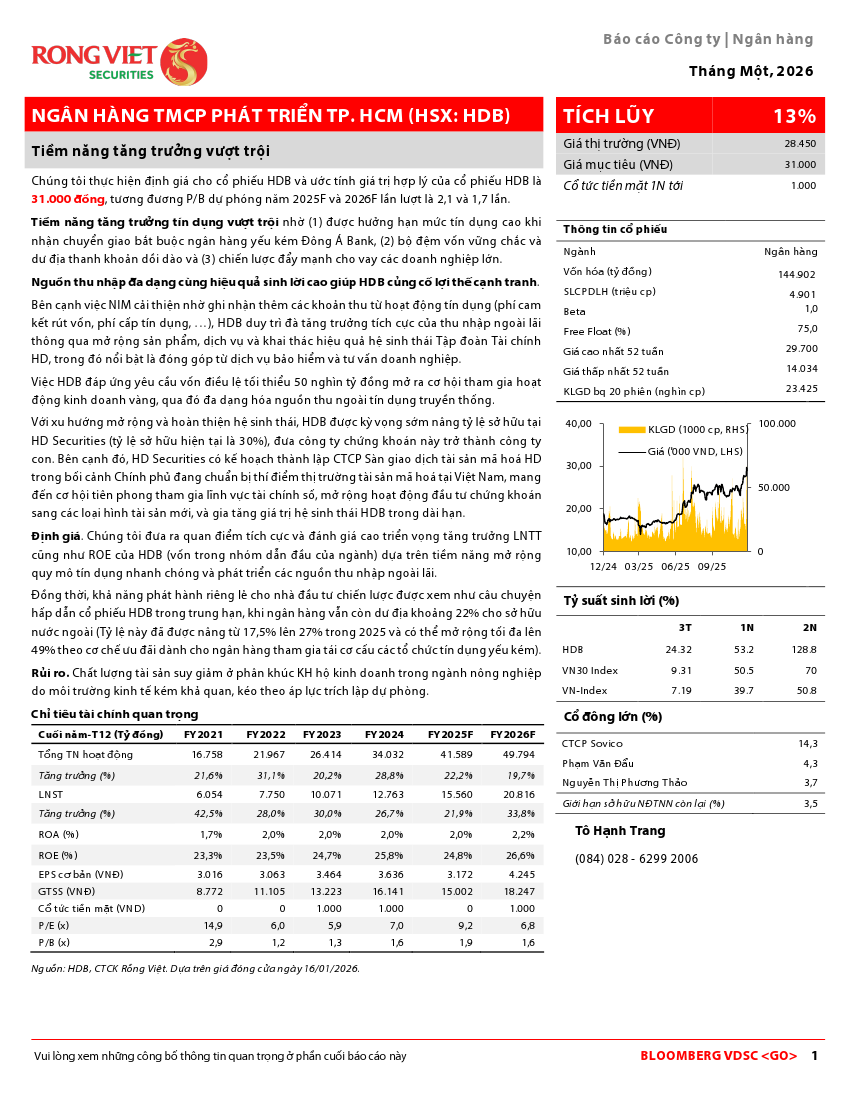 HDB: Khuyến nghị TÍCH LŨY với giá mục tiêu 31,000 đồng/cổ phiếuNguồn: VDS Tải về 16/01/2026 |