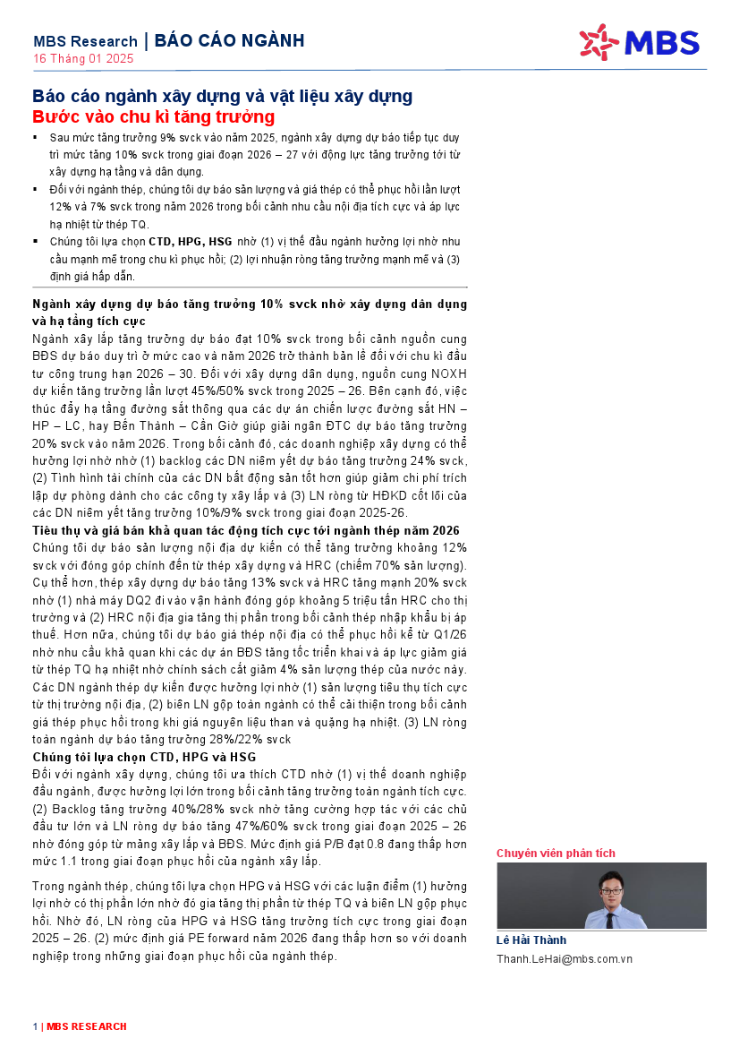 Báo cáo ngành Xây dựng và VLXD: Bước vào chu kì tăng trưởngNguồn: MBS Tải về 16/01/2026 |
